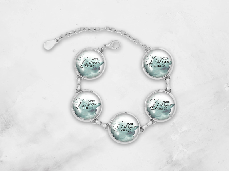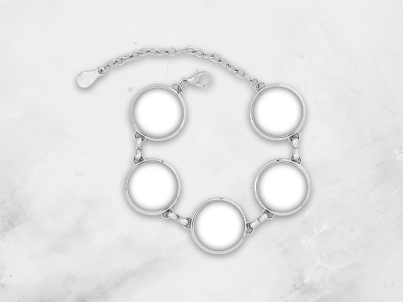 This 5 charm bracelet is made out of zinc-alloy links for durability and features 5 aluminium plates for printing. Link Size: 18x18mmBracelet length: 24cm