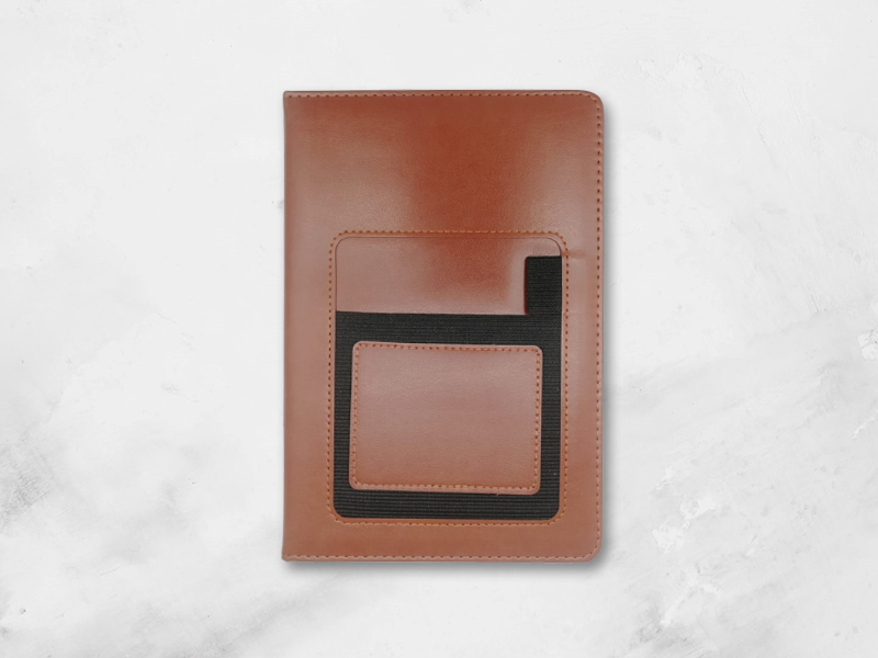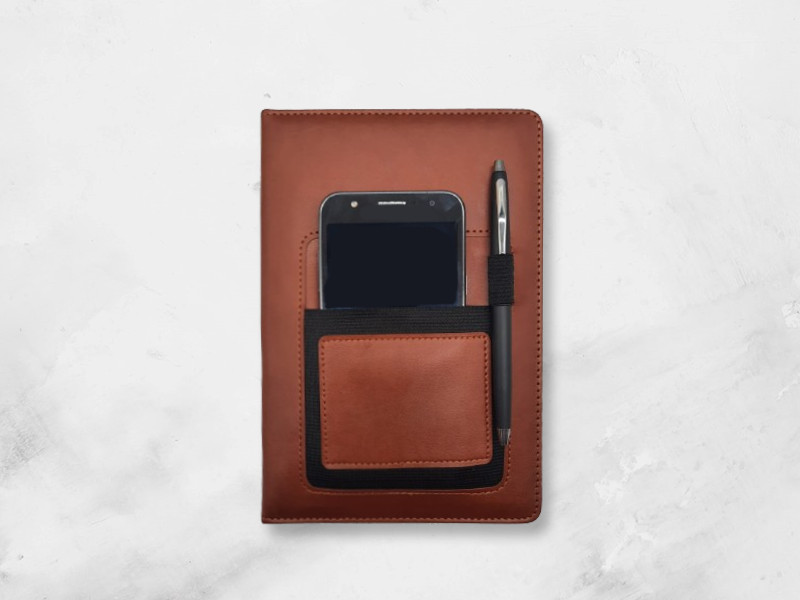 This classic feel notebook is made from PU leather and features an elasticated mobile phone pocket, which enables you to carry your phone securely with your notebook, plus a pen loop. It has 160 pages (80 sheets) of 70gsm, cream coloured, lined paper. Size: A5 , 1 x 14 x 1.5cm